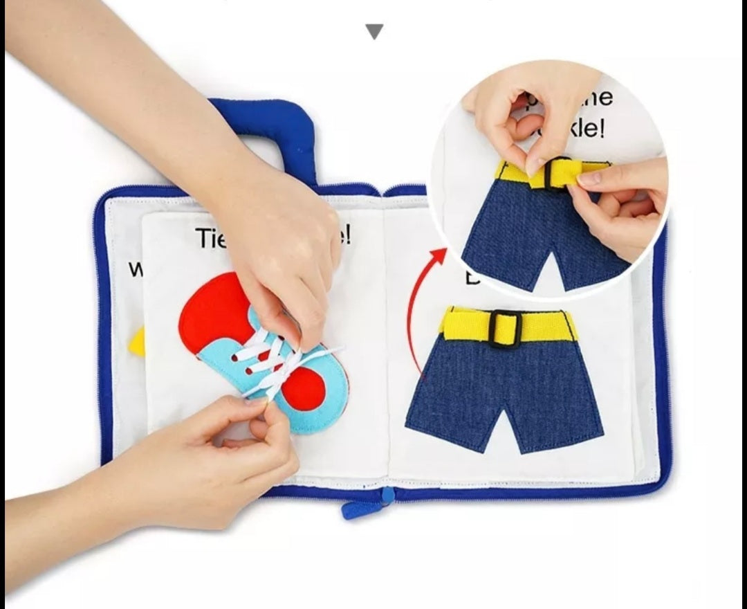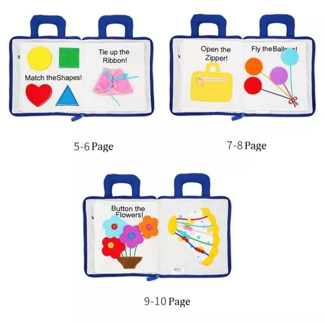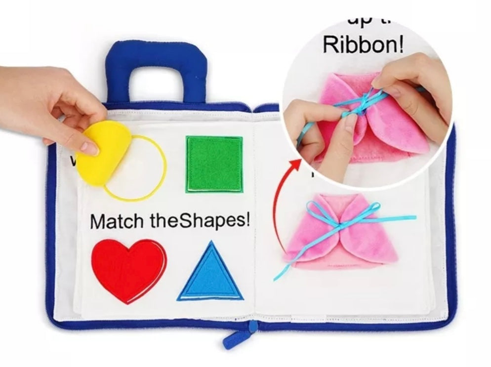 This fun, learning, engaging handmade fabric book will keep toddlers and pre-schoolers busy for hours! Soft yet durable which zips closed making sure all the pieces stay inside. A unique gift that will be their favourite for a long time. Learn how to tell the time, sort and match colours and shapes. Zipping and tying page which is great for gross motor skills.