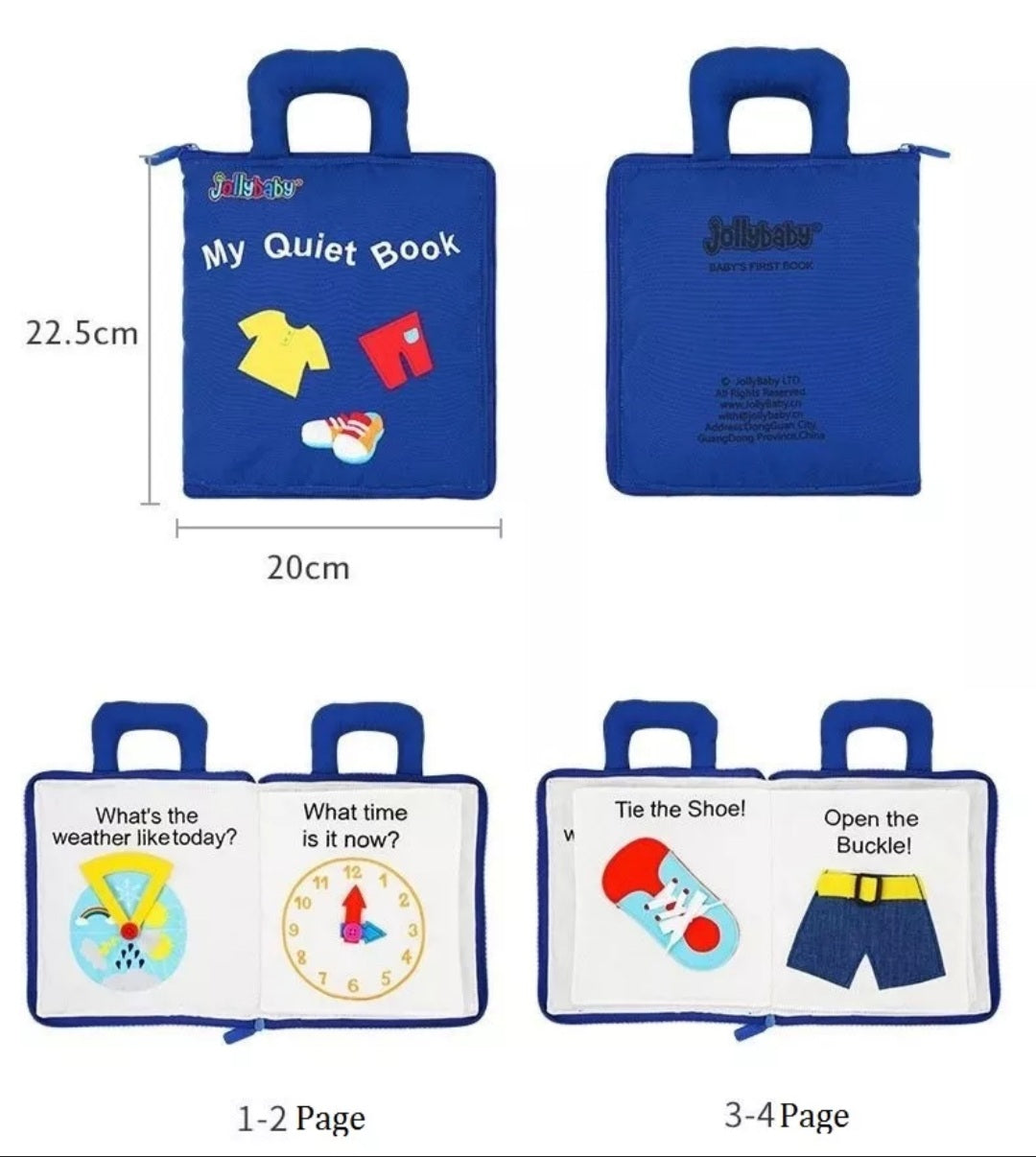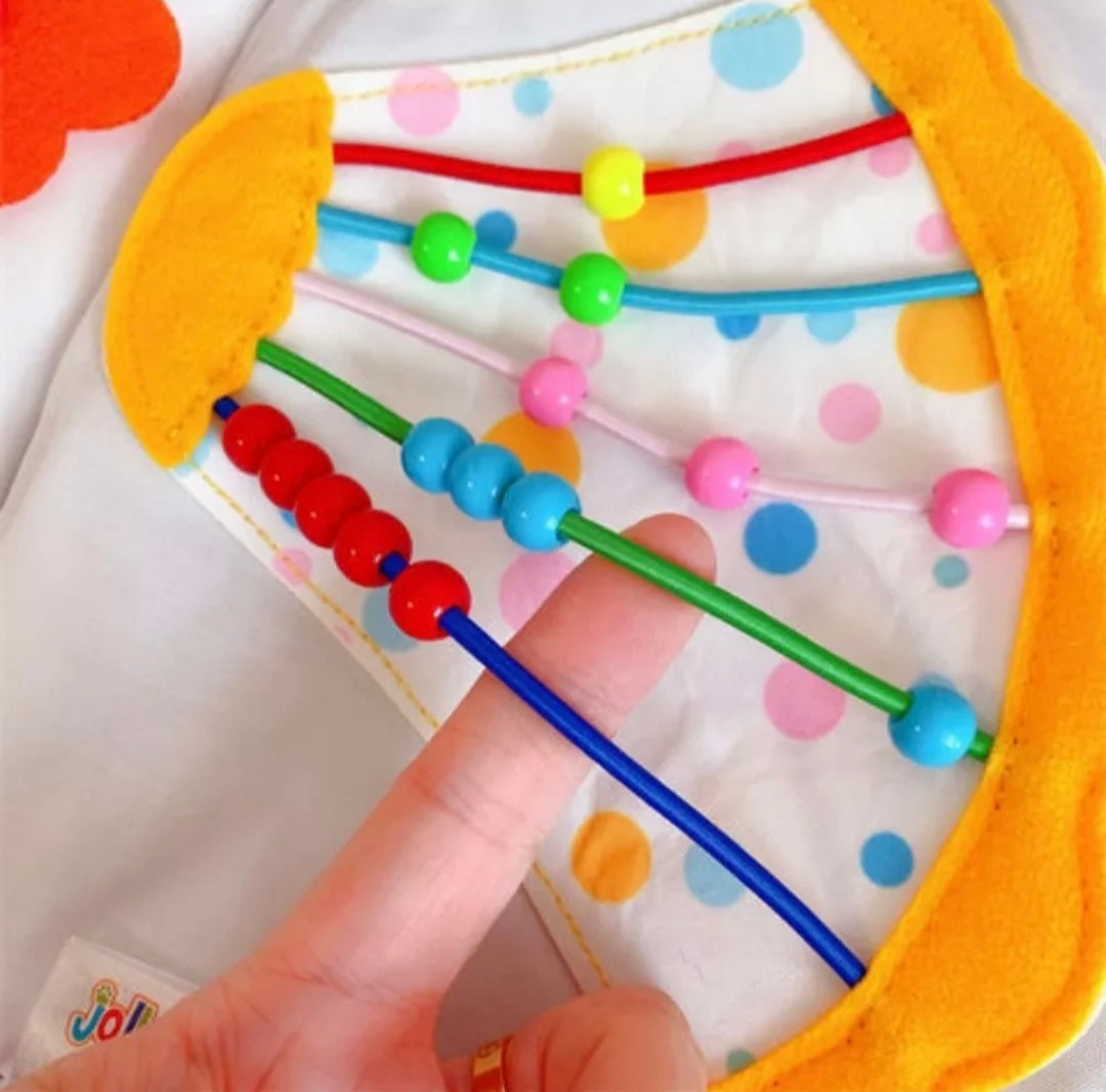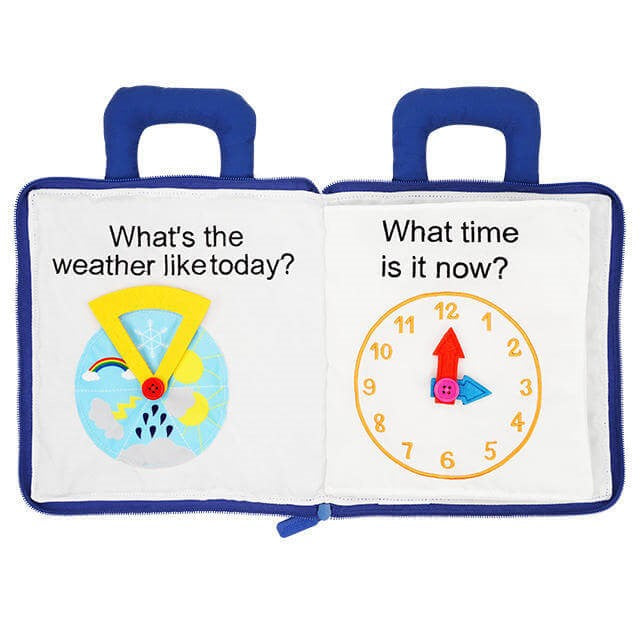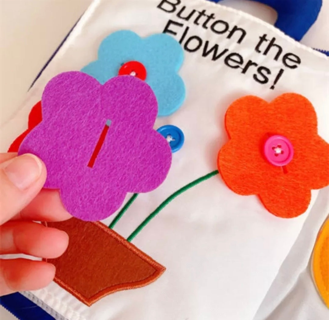 This fun, learning, engaging handmade fabric book will keep toddlers and pre-schoolers busy for hours! Soft yet durable which zips closed making sure all the pieces stay inside. A unique gift that will be their favourite for a long time. Learn how to tell the time, sort and match colours and shapes. Zipping and tying page which is great for gross motor skills.